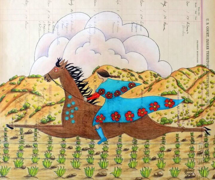 - Antique "Indian Territory" ledger paper ca. 1900s, colored pencil, India ink, 15.5 x 13 in. - 22.5 x 18.5 in. Framed